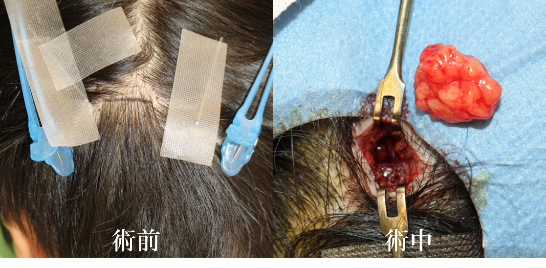 頭頂部に径4.5cmの軟らかい皮下腫瘤を認めました。
