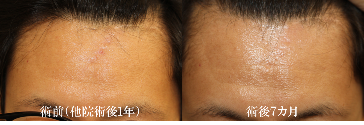 過去に転倒し前額を受傷し、救急外来で縫合処置を受けました。その後傷跡が凹んで目立ったため約1年前に瘢痕形成術を受けたとのことです。術後数カ月してからまた同じように陥凹して目立つようになったため当院を受診されました。術前の写真では線状に凹んでいるのが分かります。どのような手術を受けたのか伺ったところ、凹んでいる前額の部分の瘢痕を切除して、また線状にそのまま縫合したとのことでした。また凹んでくるかもしれないと言われたそうです。