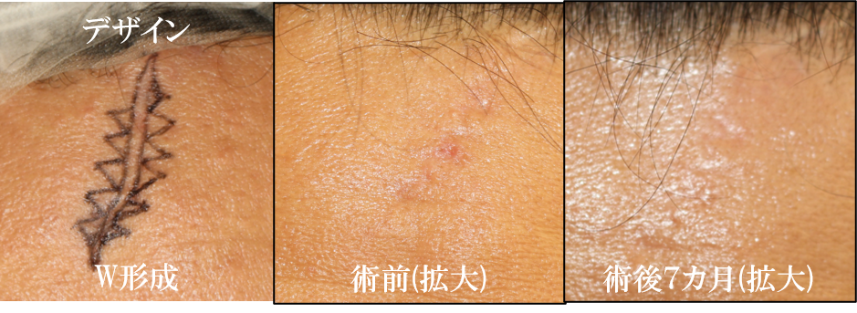 当院ではW形成術を行いました。 W形成でジグザグにすることにより、縮もうとする力を分散させ(細かい三角形がかみ合ったようになるため線状にも凹みづらい)、伸び縮みの動きによる引きつれ防止(アコーディオン効果)や、前述したシワに沿わない瘢痕の向きを変えて目立ちにくくする効果(本症例では前額は横のシワのため、w形成のジグザグの辺が1方向は横のシワの向きに一致するようにデザイン)が得られます。